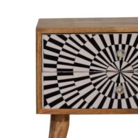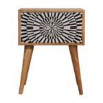 This bedside has been constructed from 100% solid mango wood and finished in a fine oak-ish finish body. The 2 drawers feature a black and white pattern which is bound to uplit your bedroom and allow you to store any bits and pieces discreetly. It also has 4 Nordic style legs and ample space on top for a lamp, photo frames or ornaments.