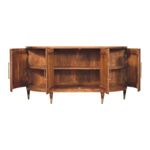 Elevate your interior with the Ravello Curved 4-Door Sideboard, beautifully crafted from 100% solid mango wood in a warm Amber Oak finish. Its elegant curved silhouette is accentuated by fluted door fronts and tapered legs with brass-finished tips, offering a refined mid-century flair. Behind the four soft-close doors lies generous storage, perfect for organizing dining or living essentials with ease. A blend of sculptural form and practical function, this sideboard brings timeless elegance and natural warmth to any contemporary or classic setting.