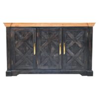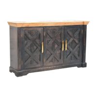 The Regal Noir Sideboard blends rustic charm with modern elegance. Featuring an ash black finish and natural oak-ish top constructed from 100% solid mango wood, its cross-panel doors and brass handles add a sophisticated touch. With ample storage behind each door, this piece combines style and function effortlessly,