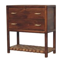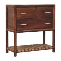 Introducing the Regency Woven 2-Drawer Nightstand, a stylish and compact storage solution. Crafted from 100% solid mango wood in a rich Chestnut finish, this piece features two compact drawers with elegant brass handles, ideal for storing smaller essentials. The standout feature is the woven braided bottom shelf, adding a touch of rustic elegance and functionality, perfect for displaying books or decor. Combining durability with sophisticated design, the Regency Woven Nightstand is a versatile addition to any bedroom or living space, offering both charm and practicality in a compact form.