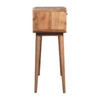 This reverse simple and elegant console table has beautifully curved edges to fit perfectly in any home or living space, suiting most interiors, this 100% solid mango wood unit has been built with sustainably sourced timbers and has two drawers and 1 open slot to help you keep your home organised and storing any little household objects. It has shiny knobs and has a fine oak-ish finish with 4 Scandinavian style legs.
