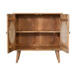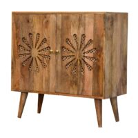 The Rosalie collection features a lovely rattan design behind by a cut-out petal pattern, giving it a contemporary spin on a retro design. This furniture collection is finished with shiny brass knobs and nordic style legs, making it ideal for any modern or global-styled home. This cabinet is made from 100% solid mango wood in an oak-ish finish, making it perfect for the bedroom, living room or hallway.