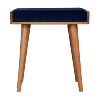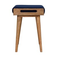 This footstool features a tray-style design and 4 Nordic-style legs constructed from 100% solid mango wood. It is upholstered in a royal blue cotton velvet, which works as a comfortable seat and can be incorporated into many different interior styles as it offers a very clean and modern design, along with providing a nice contrast between the material and wood.