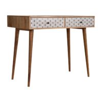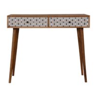 This 2 Drawer console table has been constructed from 100% solid mango wood and has been finished with an oak-ish finish body. The main features of this piece are the screen printed drawer fronts which have a beautiful black and white geometric design giving the piece extra dimension and character. Useful storage is provided with the spacious drawers that can be used to store any papers, notebooks or stationary. It also has 4 Nordic style legs and a good sized table top to work or study on.