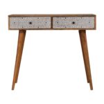 This 2 Drawer console table has been constructed from 100% solid mango wood and has been finished with an oak-ish finish body. The main features of this piece are the screen-printed drawer fronts which have a beautiful black and white geometric design giving the piece extra dimension and character. Useful storage is provided with spacious drawers that can be used to store papers, notebooks, or stationary. It also has 4 Nordic-style legs and a good-sized tabletop to work or study on.