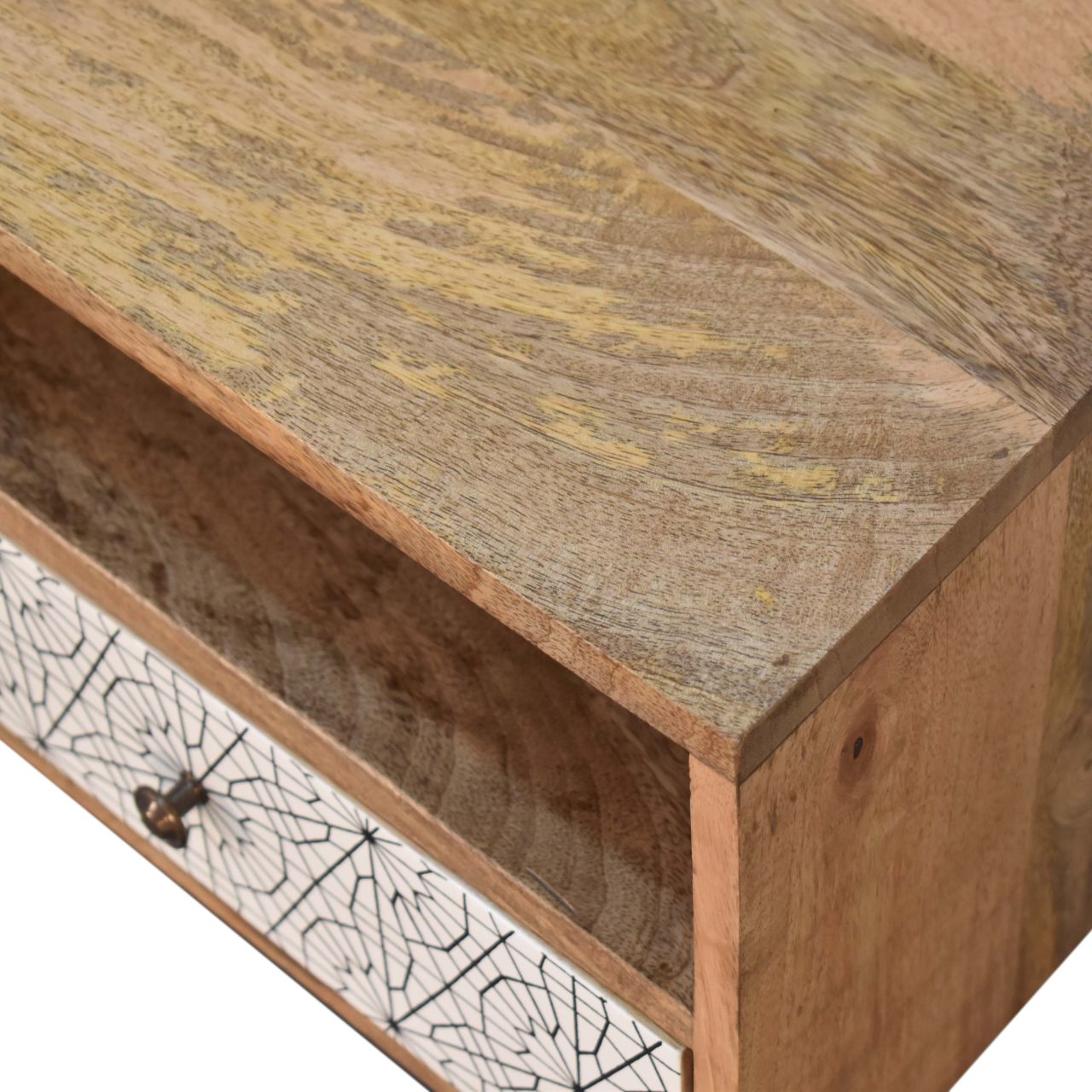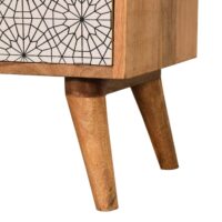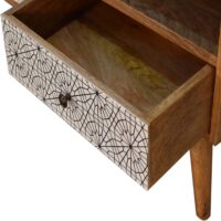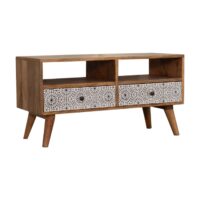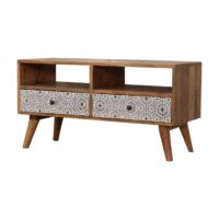 This 2 drawer media unit has been constructed from 100% solid mango wood and finished in a fine oak-ish finish body. The main feature of this piece is the screen-printed drawer fronts, Nordic style legs with shiny knobs. Each drawer front has a beautiful black and white geometric design giving the piece extra dimension and character. Useful storage is provided with open slots and drawers that can be used to store any CDs, films, or books.