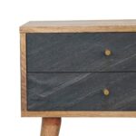 This bedside has been constructed from 100% solid mango wood in a fine oak-ish finish. The beautiful slate drawers are definitely prominent in this piece and provide a lovely contrast with the finish of the wood. Other features include nordic style legs and shiny bass knobs.