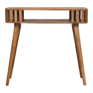 A striking blend of contemporary design and artisanal craftsmanship, this console table is handcrafted from 100% Solid Mango Wood in a warm Oak-ish finish. Featuring an eye-catching slatted design, it creates an airy, open aesthetic while offering a functional open shelf for easy storage. The elegantly tapered legs add a touch of mid-century modern charm, making it an ideal addition to hallways, living spaces, or entryways. Sustainable, stylish, and versatile, this piece seamlessly combines practical utility with refined elegance, bringing a natural and sophisticated touch to any interior.