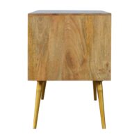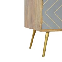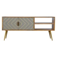 This media unit has been inspired by a clean and modern finish design. It has been constructed from 100% solid mango wood in an oak-ish finish and its main feature is the grey cement door fronts with a beautiful golden brass inlay and 4 gold Nordic style feet which compliments the wooden body perfectly. It has 2 open slots for storing any bits and pieces for placing any books, magazines, or ornaments for quick access. It can be partnered with the other pieces from the collection or stand graciously alone.