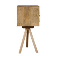This unique little bedside features a tripod stand with an open slot and a small door allowing you to discreetly store any small belongings before bedtime. It has been constructed from 100% solid mango wood and finished in an oak-ish finish. As it is a simple and timeless piece it can be partnered with many different styles and colours of furniture and fit in perfectly in any bedroom .