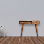 This timeless and understated solid wood desk is set on 4 Nordic style legs and has all the essential storage you will need, including a decent-sized tabletop, 1 drawer that comes with a shell handle, and an open shelf to place magazines and papers. It is constructed from 100% solid mango wood and has a fine oak-ish finish.