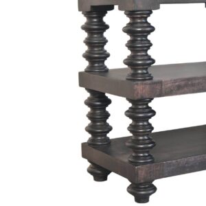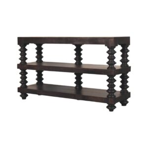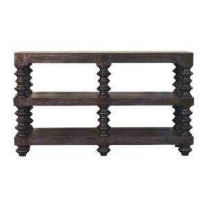 A bold statement in form and function, this handcrafted console is made from 100% solid mango wood and finished in a deep Carbon Ash tone. Its distinctive spindle-shaped pillars give the piece architectural depth, while three generously spaced shelves offer ample room for storage and display. Whether styled as a hallway console, open bookshelf, or media unit, this piece blends sculptural detail with everyday practicality.