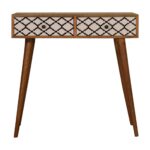 This 2 drawer console table has been constructed from 100% solid mango wood and finished in a fine oak-ish finish body. The main feature of this piece are the patterned screen printed drawer fronts which have a beautiful black and white design giving the piece extra dimension and character. It also has 4 Nordic-style legs and ample space on top for a plant, photo frames, or a lamp.
