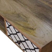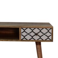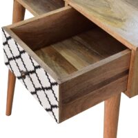 This 1 drawer writing desk has been constructed from 100% solid mango wood and finished in a fine oak-ish finish body. The main feature of this piece is the patterned screen-printed drawer which has a beautiful black and white geometric design giving the piece extra dimension and character. It also has 4 Nordic-style legs, 1 large open slot, and ample space on top for studying.