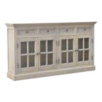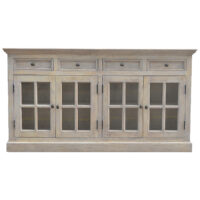 This country sideboard is constructed from 100% solid mango wood which is meticulously hot dipped using a laborious caustic wash technique. This lengthy multi stage finishing process gives a beautiful weathered and aged acid washed finish. It comes with 4 glazed doors with shelves inside and 4 drawers; to place things such as special ornaments, pictures etc. The door cabinets and drawers come with shiny, round knob handles.