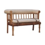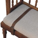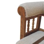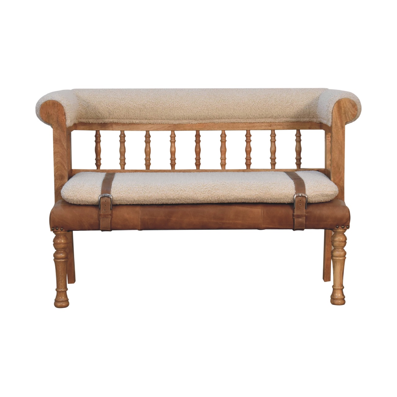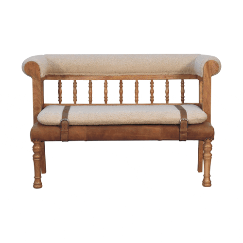 Add some luxury style to your home living area with this fabulous carved hallway bench. It is constructed from 100% solid mango wood in an oak-ish finish and upholstered in 100% cream boucle which is presented on the seat and backrest. Other features include buffalo leather buckle straps which can be secured or undone and hand turned front legs.