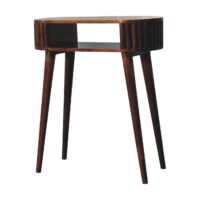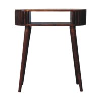 This simple writing desk offers a contemporary style with its distinctive stripe design. It has been constructed from 100% solid mango wood in an chestnut finish and features 1 open shelf for convenience in the bedroom.