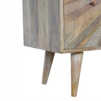 This cabinet has been designed to provide a convenient storage space for your home. It has been constructed from 100% solid mango wood in a oakish finish with a sunrise pattern followed by shiny candle knobs. Offering a modern retro aesthetic, this cabinet is both a handy and timeless option for your home.