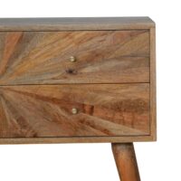 For storing everyday essentials this piece of furniture will prove handy all over your home. It is constructed from 100% solid mango wood in a oak-ish finish and has a sunrise pattern on the drawer fronts. It features 4 nordic style legs and shiny candle knobs. This console table is easy as well as practical making it the perfect addition to the home.