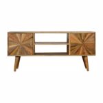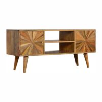 This functional TV stand is designed with shelving and cupboard compartments that provide convenient storage space for your media units. It has been constructed from 100% solid mango wood in a oakish finish with a sunrise pattern followed by shiny candle knobs. Offering a modern retro aesthetic, this media unit is a timeless option for your home.