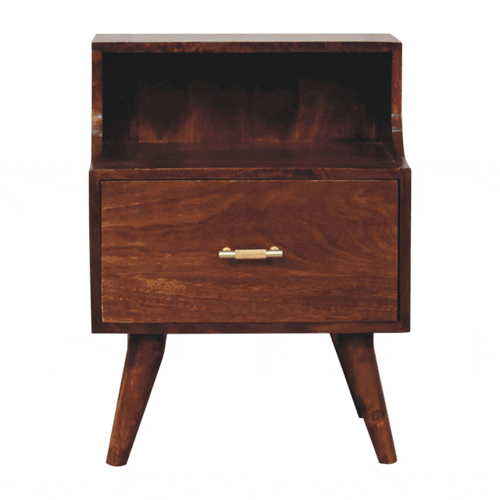 This bedside table is the perfect stand for any bits and pieces you wish to keep nearby before bedtime. It features a raised open slot providing ample space for a lamp, photo frame or any ornaments. It has been constructed from 100% solid mango in a chestnut finish, and has a t-bar handle drawer, as well as Nordic style legs.
