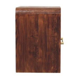 Introducing the Tiger Oak Open Bedside — a striking blend of form and function. Crafted with a robust outer structure in solid oak and supported by mango wood inners and base, this piece is hand-distressed to highlight the unique tiger-grain pattern. The single drawer is adorned with an elegant brass handle, while the open shelf above offers convenient storage or display space. With its bold textures and timeless silhouette, this handcrafted masterpiece brings character and sophistication to any bedroom setting.