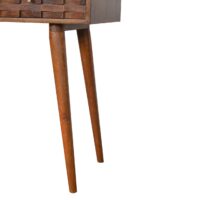 This console table has been handcrafted from 100% solid mango wood in a chestnut finish. It features Nordic-style legs with 2 drawers that feature shiny candle knobs. This piece offers a subtle tile hand-carved design on the drawer fronts which will create a modern look in your home and can be paired nicely with the rest of the collection.