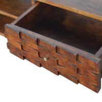 This TV Unit has been hand crafted from 100% solid mango wood in a chestnut finish. It features nordic style legs with 2 open slots and 2 drawers which feature shiny candle knobs. This piece offers a subtle tile hand carved drawer front which will create a modern look in your home. The perfect piece for your living room.