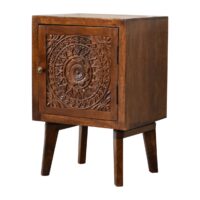 This bedside features a lovely patterned surface on the door front for a modern, minimalist aesthetic. It provides slots inside for storage space for versatile and practical use. Ithas been constructed from 100% solid mango wood and has a fine chestnut finish with a shiny brass knob on the door.