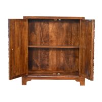 This cabinet features a lovely patterned surface on the door fronts for a modern, minimalist aesthetic. It provides slots inside for storage space for versatile and practical use. It has been constructed from 100% solid mango wood and has a fine chestnut finish and shiny brass knobs.