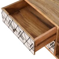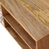 This 2 drawer media unit has been constructed from 100% solid mango wood and finished in a fine oak-ish finish body. The main feature of this piece is the triangle screen printed drawer fronts which have a beautiful black and white geometric design giving the piece extra dimension and character. It also has 4 Nordic-style legs, 2 open slots, and ample space on top for a lamp, photo frames, or ornaments.