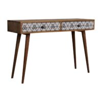 This 2 drawer console table has been constructed from 100% solid mango wood and finished in a fine oak-ish finish body. The main feature of this piece are the screen printed drawer fronts which have a beautiful black and white geometric design giving the piece extra dimension and character. It also has 4 Nordic style legs and ample space on top for a plant, photo frames or ornaments.