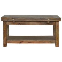 This solid wood Extending Coffee Table has an appealing rusticity and charm, constructed from 100% solid mango wood in an oak-ish finish, the no fuss finish reveals the beautiful grain of the fruit-wood mango wood which this beautiful piece of furniture is made of. Every piece of furniture is individually handcrafted and includes swing care tickets explaining the cautions and aftercare instructions.