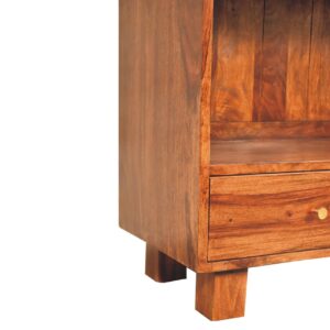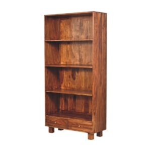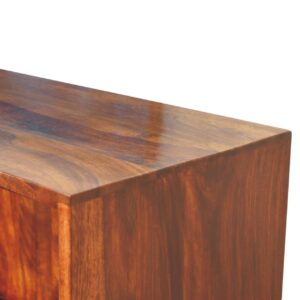 Introducing the Tula Bookcase, crafted from the finest Sheesham wood and finished in a rich chestnut hue that effortlessly enhances any room’s ambiance. This elegant bookcase features shiny brass knobs and straight mini feet, blending functionality with a sophisticated design. Perfect for showcasing your cherished book collection, decorative items, or both, the Tula Bookcase’s shelves and compact design ensure it fits seamlessly into your living space.