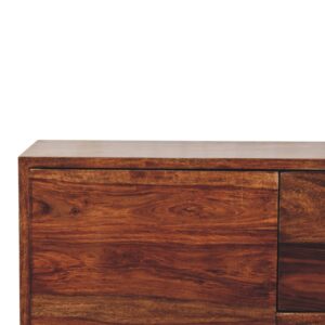 Introducing the Tula Sideboard, crafted from the finest Sheesham wood and adorned with a chestnut finish that instantly warms up any living space. This elegant sideboard combines functionality with a sophisticated design, featuring shiny brass knobs and straight mini feet for a sleek, timeless look. Perfect for storing dinnerware, linens, or even media devices, the Tula Sideboard offers ample storage without compromising on style. Its compact design ensures it fits seamlessly into your home, providing a practical and stylish solution for keeping your space organized and clutter-free.