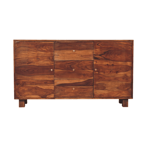 Meet the Tula Large Sideboard, beautifully crafted from Sheesham wood with a warm chestnut finish. This spacious sideboard features shiny brass knobs and straight legs, offering ample storage and a timeless look. Ideal for storing dinnerware, linens, or living room essentials, it seamlessly blends functionality with style. Perfect for any space needing extra storage with a touch of elegance.
