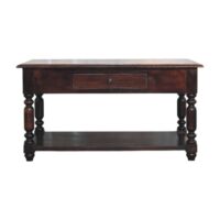 Introducing a timeless blend of elegance and functionality, this console table is crafted from 100% solid mango wood in a rich Cherry finish. It features a single compact drawer for discreet storage and a spacious lower shelf for showcasing decor or organizing essentials. The distinctive Turned Legs add a classic charm, making it perfect for entryways, hallways, or living rooms. Durable and stylish, this piece enhances any space with its sophisticated design.