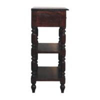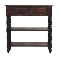 Elevate your space with the Turned legs Cherry Side Table, a perfect blend of classic charm and practicality. Crafted from 100% solid mango wood in a rich Cherry finish, this table features two compact drawers for discreet storage and two open shelves for displaying decor or organizing essentials. The intricately turned legs lend a timeless, elegant appeal, making it an ideal addition to entryways, hallways, or living rooms. Combining durability with sophisticated design, the Turned legs Cherry Side Table is a versatile and stylish solution to enhance your home décor.
