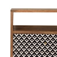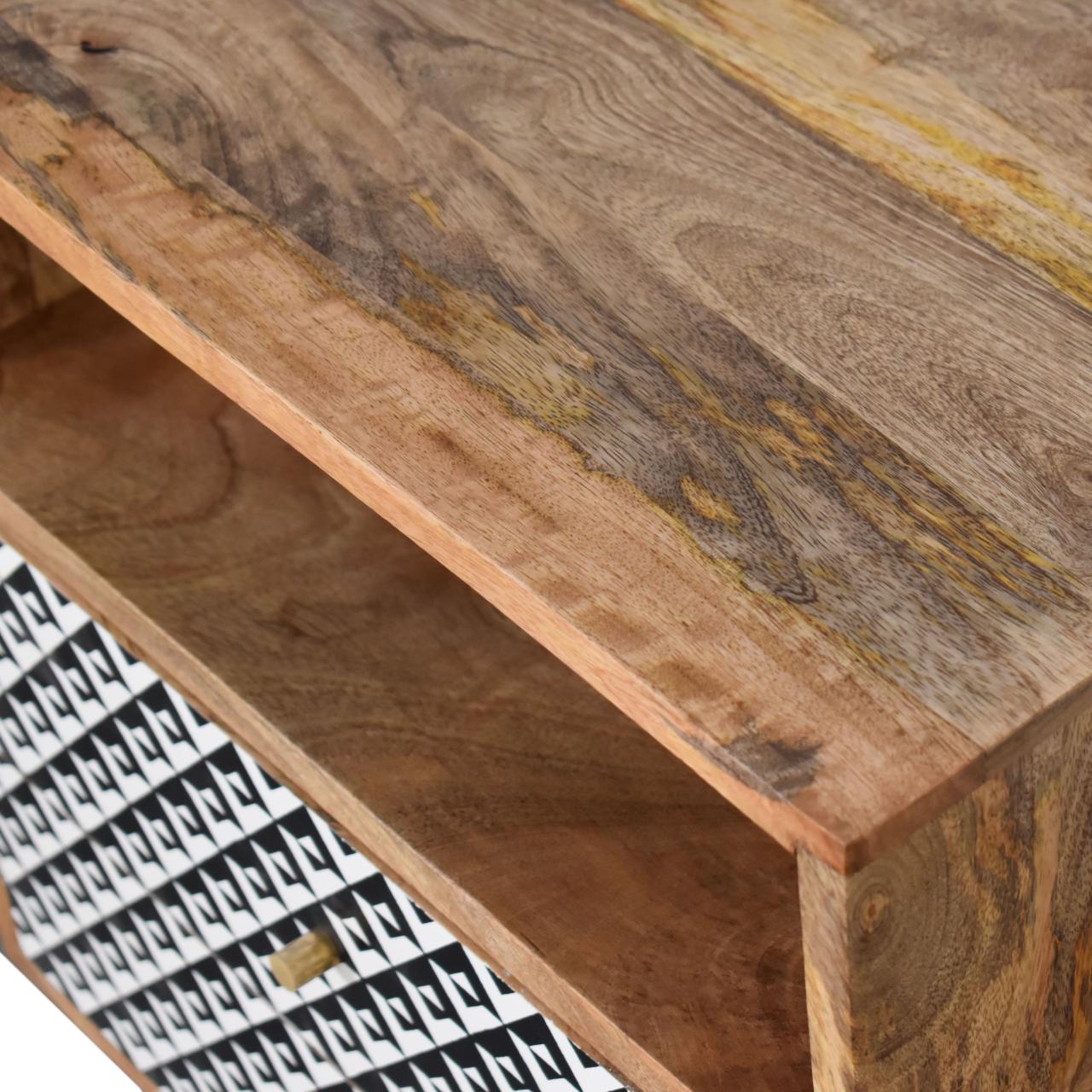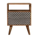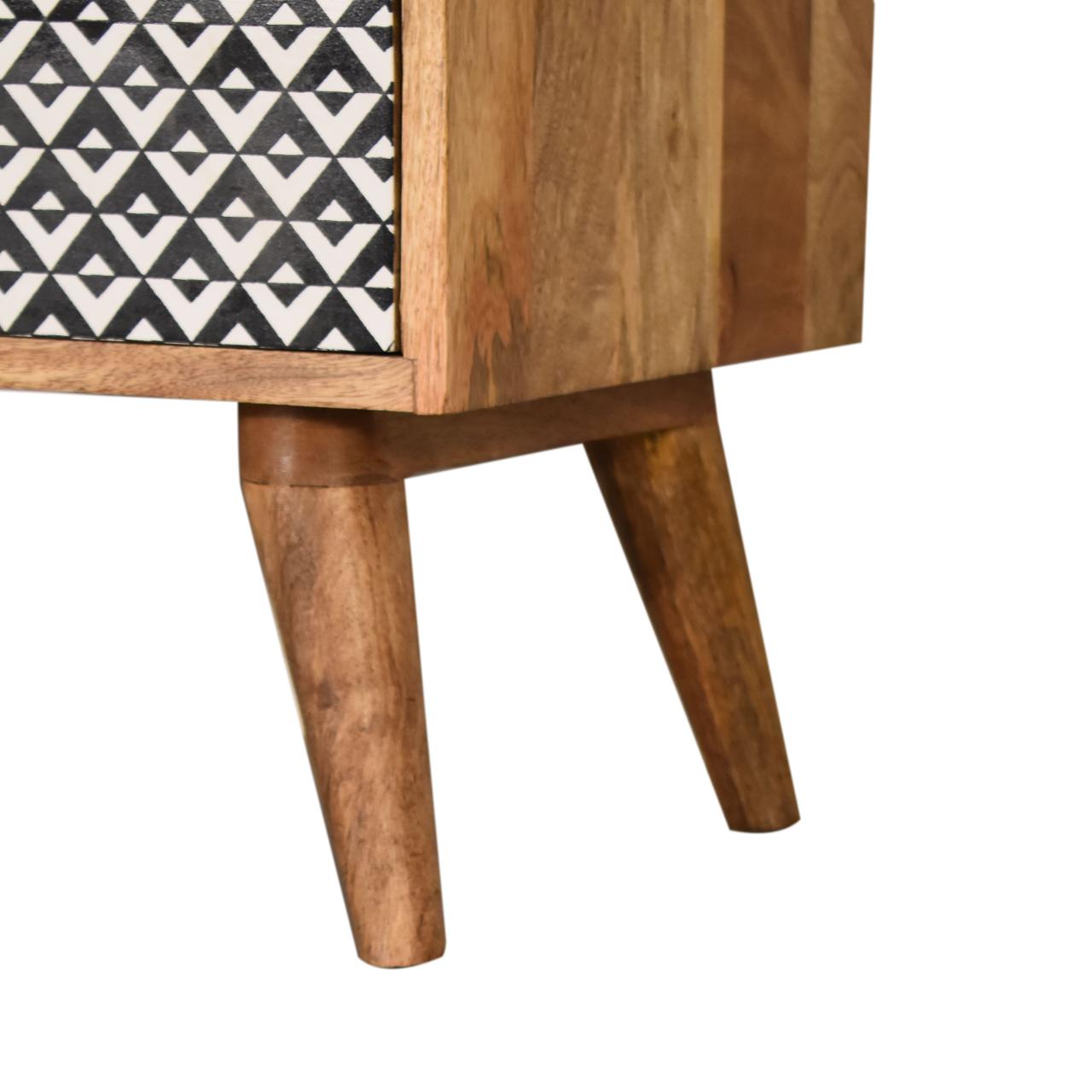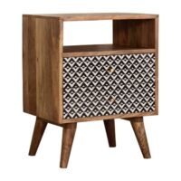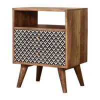 This bedside has been constructed from 100% solid mango wood in a fine oak-ish finish. The 2 drawers feature a black and white screen printed pattern which is bound to uplift your bedroom and allow you to store any bits and pieces discreetly. It also has 4 Nordic style legs and ample space on top for a lamp, photo frames or ornaments.
