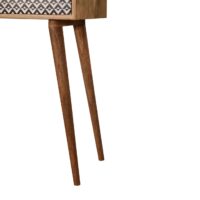 This console table has been constructed from 100% solid mango wood in a fine oak-ish finish. The 2 drawers feature a black and white screen printed pattern which is bound to uplift your living room or hallway and allow you to store any bits and pieces discreetly. It also has 4 Nordic style legs and ample space on top for a plant, candle or ornament.