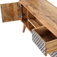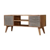 This media unit has been constructed from 100% solid mango wood in a fine oak-ish finish. The 2 doors feature a black and white screen printed pattern which is bound to uplift your living room and allow you to store any bits and pieces discreetly. It also has 4 Nordic style legs, 2 open slots and ample space on top for a TV.