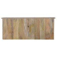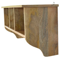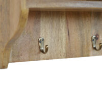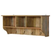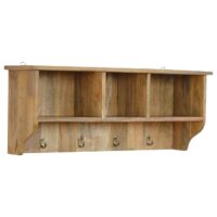 A simple but handy coat rack and shelf in solid mango wood with an oak-ish finish. It offers five hand forged antiqued brass hooks offering three shelves for storing any keys hats, gloves or small pieces. This coat rack takes up no floor space and can be hung above a console or bench using subtle eye hooks.