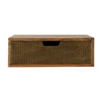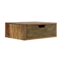 This wall mounted unit has been constructed from 100% solid mango wood in a oak-ish finish and features 1 honeycomb design brass plated front drawer which features a cut out design for easy access into the drawer. This piece is perfect for storing any bits and pieces you wish to keep close by before bedtime. It’s neat and clean design can easily be mounted on the wall without the fuss of any legs. Caution! Do not sit on the unit.