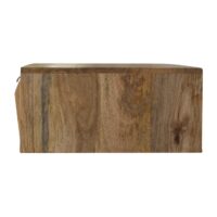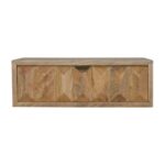 This wall-mounted bedside has been constructed from 100% solid mango wood in an oak-ish finish and features 1 hand-carved prism drawer with a pull-out handle. This piece is perfect for storing any bits and pieces you wish to keep close by before bedtime. Its neat and clean design can easily be mounted on the wall without the fuss of any legs. Caution! Do not sit on the unit.