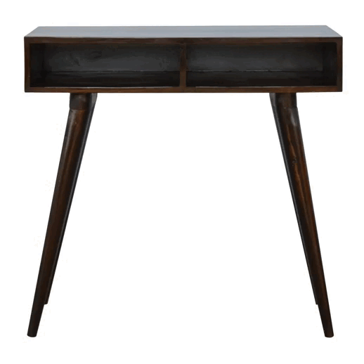 Combining both a modern and vintage style to furniture, this solid wood writing desk provides ample space for you to work on. It is constructed from 100% solid mango and has a rich walnut finish. Other features include 2 open shelves to place any notebooks, papers or stationary and a decent sized table top to work on or place a computer/laptop. The perfect addition to any home, with its clean design to suit most decors.