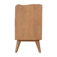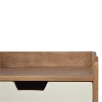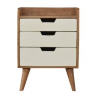This Nordic painted bedside table is the perfect stand for any bits and pieces you wish to keep nearby before bedtime. It features ample space for a lamp, photo frame or any ornaments. It has been constructed from 100% solid mango wood with a fine sunbleach finish body and 3 white hand painted drawer fronts. Some other product characteristics are 4 Nordic style legs and cut out slots for easy access to and from the drawers. A lovely addition to the home. Every piece of furniture is individually handcrafted and includes swing care tickets explaining the cautions and aftercare instructions.