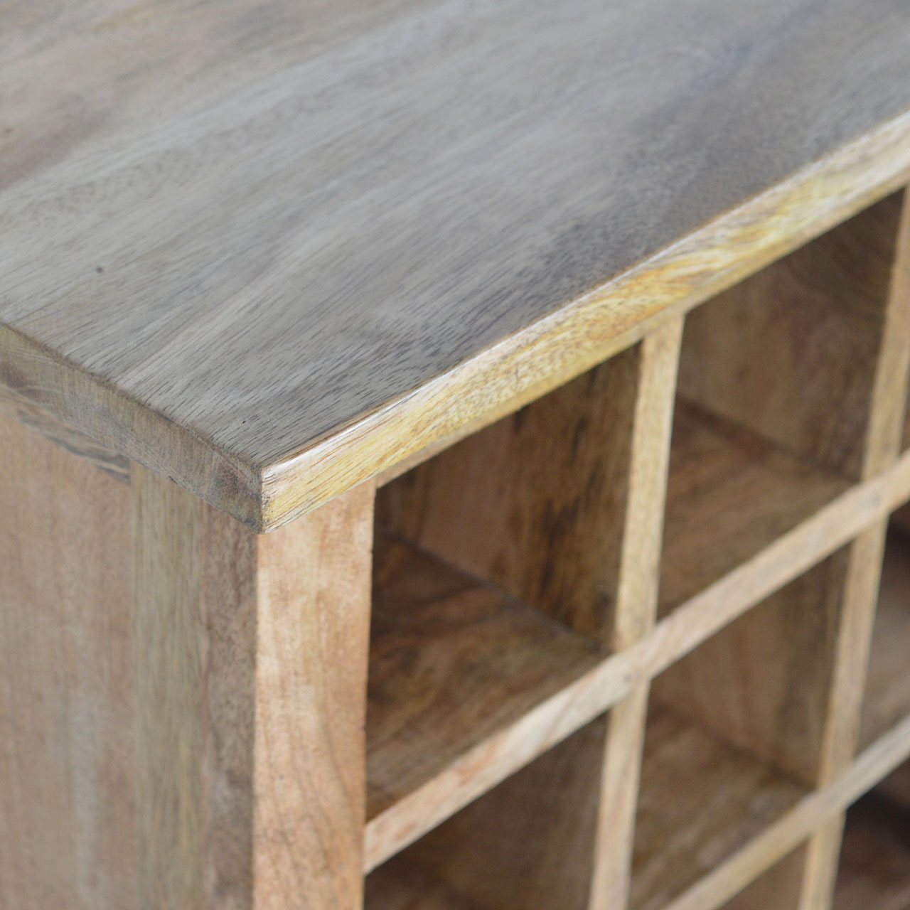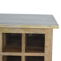 This is a beautifully handcrafted cabinet that offers 3 drawers and 9 wine bottle slots, it is constructed from 100% solid mango wood with an oak-ish finish. The slots are ideal to store any wine bottles and groceries or bits and bobs for the kitchen on the lower three shelves. It is practical storage that is built to last and is the perfect addition to any kitchen or dining room. Every piece of furniture is individually handcrafted and includes swing care tickets explaining the cautions and aftercare instructions.