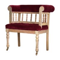 Add some luxury style to your home living area with this fabulous bench. It is constructed from 100% solid mango wood in a oak-ish finish and upholstered in cotton velvet. Other features include a detailed open back design and hand turned front legs with casters.
