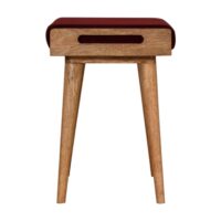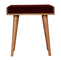 This footstool features a tray-style design and 4 Nordic-style legs constructed from 100% solid mango wood. It has been upholstered in a wine red cotton velvet that works as a comfortable seat and can be incorporated into many different interior styles as it offers a very clean and modern design, along with providing a nice contrast between the material and wood.