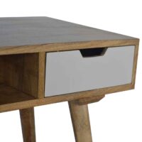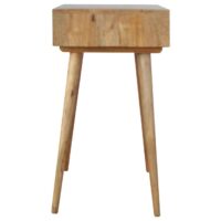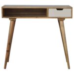 Inspired by a Nordic painted design, this solid wood writing desk provides ample space for you to work on. It is constructed from 100% solid mango wood and has a fine oak-ish finish. Other features include 1 open shelf, 1 hand painted drawer which has a cutout handle and a decent sized tabletop. Every piece of furniture is individually handcrafted and includes swing care tickets explaining the cautions and aftercare instructions.